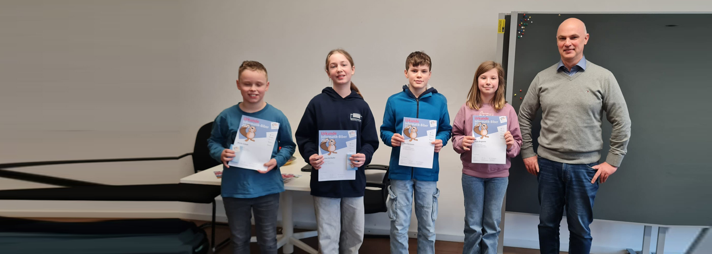 Preisträger eines 1. Preises der Jahrgangsstufe 5: Leyla Bergmann, Theo Herrmann Moritz Schott, Maxima Vorläufer, Elias Bergmann. Die Siegerehrung fand durch Jürgen Hartmann (Fachsprecher Informatik) in Anwesenheit der Schulleitung statt.