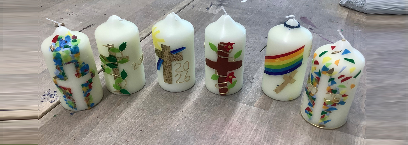 Die beiden katholischen Religionskurse der Klasse 5 haben gemeinsam mit ihren Lehrerinnen sowie den Patinnen und Paten Osterkerzen gestaltet. Nachdem sie sich im Unterricht mit dem Osterfestkreis und der Symbolik der Osterkerze beschäftigt hatten, konnten sie nun selbst Kerzen nach ihren eigenen Vorstellungen verzieren. Dabei hatten sie nicht nur viel Freude, sondern haben auch tolle Ideen entwickelt und umgesetzt.