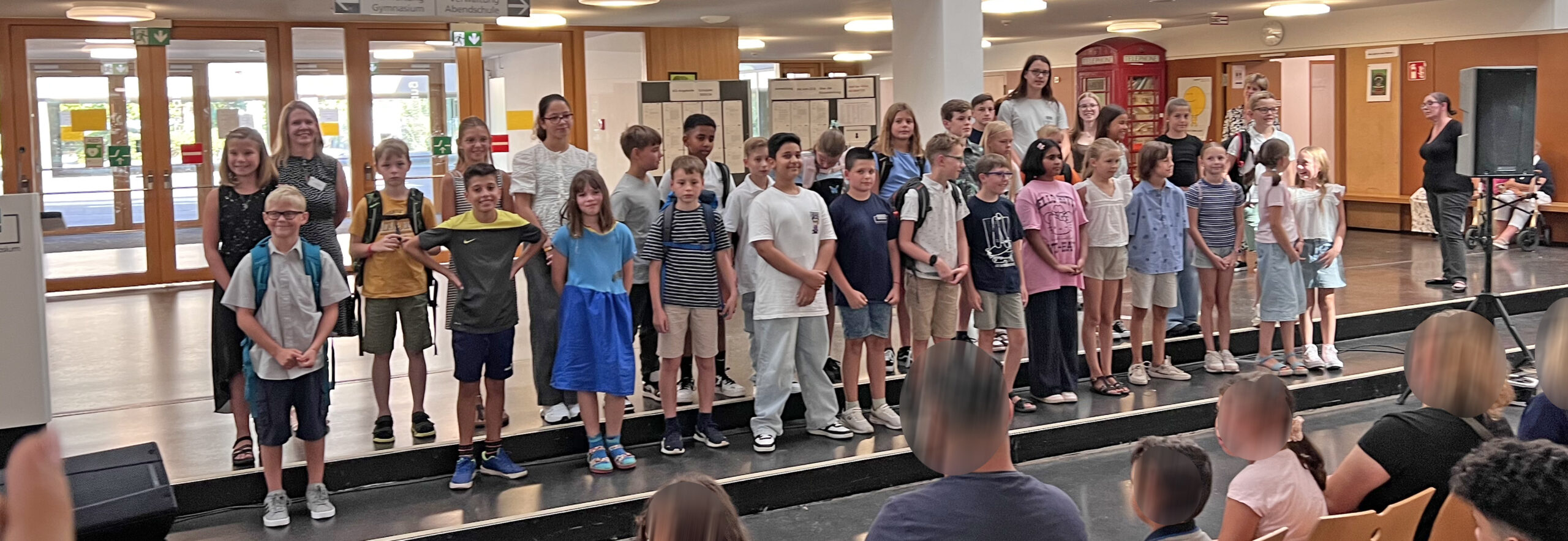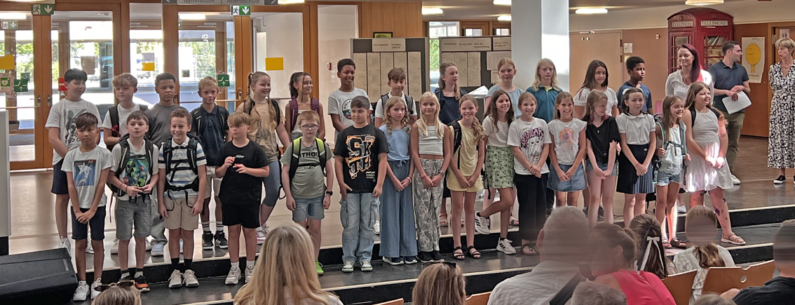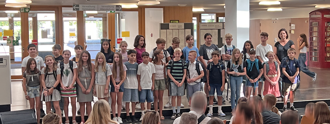 Wir freuen uns über unsere neuen Fünftklässlerinnen und Fünftklässler, die wir diese Woche in unsere Schulgemeinde aufgenommen haben! Beim Einschulungsgottesdienst wurde in diesem Jahr besonders der Aspekt des „Weiterdenkens“ unseres Schulmottos aufgegriffen und mit dem Symbol des „roten Fadens“ verknüpft. Der Chor, zahlreiche Schülerinnen und Schüler – vor allem aus der Jahrgangsstufe 6 – sowie die Religionslehrkräfte und die Pfarrer der katholischen und evangelischen Gemeinde haben zur lebendigen Gestaltung dieses Gottesdienstes beigetragen. Die anschließende Einschulungsfeier in der Schule wurde vor allem durch den Einsatz der Bigband, der SV, des Schulelternbeirats und der Technik-AG bereichert. Wir bedanken uns bei allen Aktiven, die zur Gestaltung der Feierlichkeiten beigetragen haben!