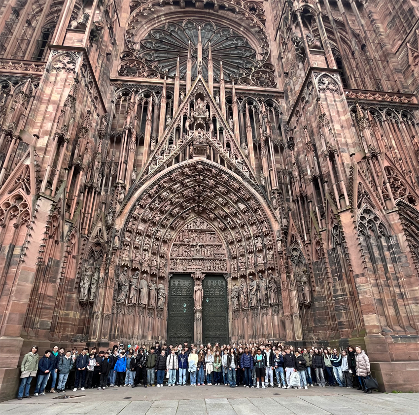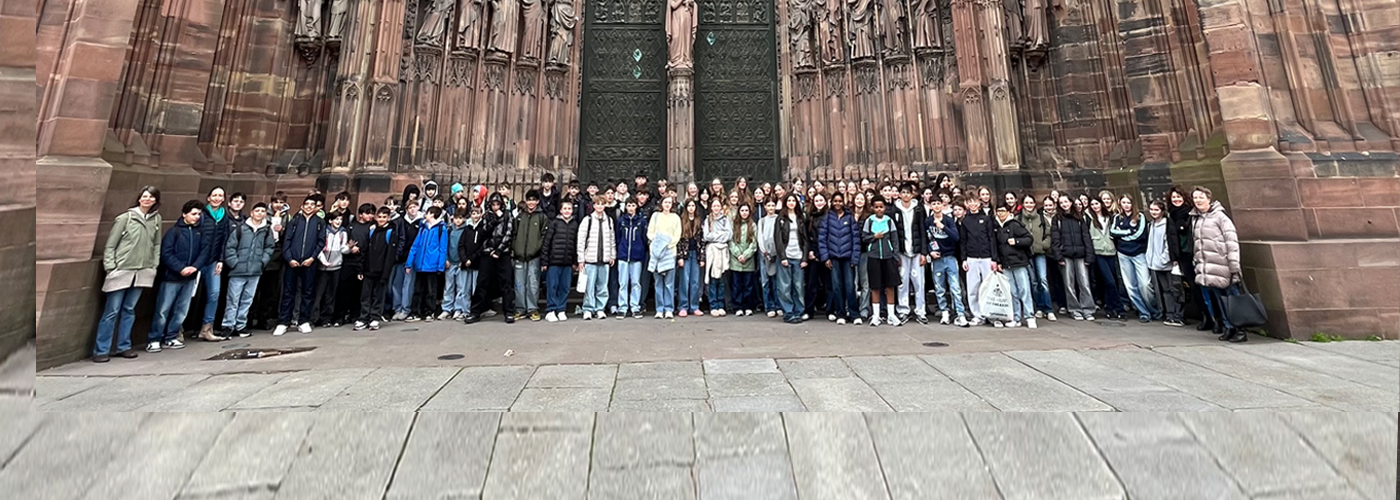 Der Tag am 14. April 2026 begann damit, dass die rund 100 Schülerinnen und Schüler sich an der Bushaltestelle vor der Schule mit Frau Dörsam, Frau Hirschmann, Frau Wilhelm-Legner und Frau Wenner getroffen haben. Nach 15 Minuten, als sich alle Klassen versammelt hatten, begann auch schon die zweistündige Fahrt mit den beiden Reisebussen nach Straßburg. Nach ihrer Ankunft liefen die vier Lerngruppen an verschiedene Startpunkte. Dort wurden dann Stück für Stück vorher im Unterricht erarbeitete Kurzpräsentationen zu einzelnen Sehenswürdigkeiten vorgetragen. Themen waren dabei beispielsweise: die Kathedrale, Produkte einer französischen Bäckerei oder das berühmte Maison des tanneurs – das Gerberhaus. Nach den Präsentationen durften sich vorher vereinbarte Gruppen von mindestens 3 Personen für zwei Stunden frei durch Straßburg bewegen.